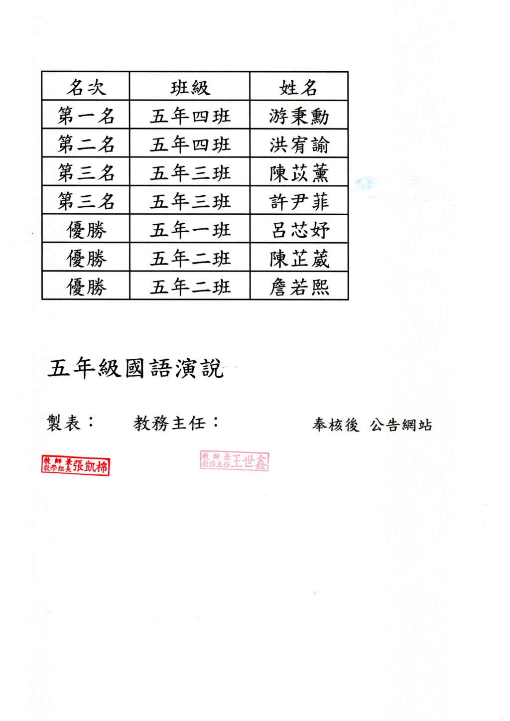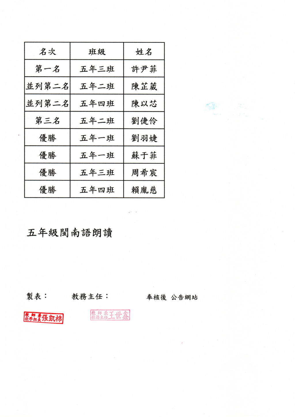 114學年度校內語文競賽五年級字音字形、閩南語朗讀及國語演說成績公告