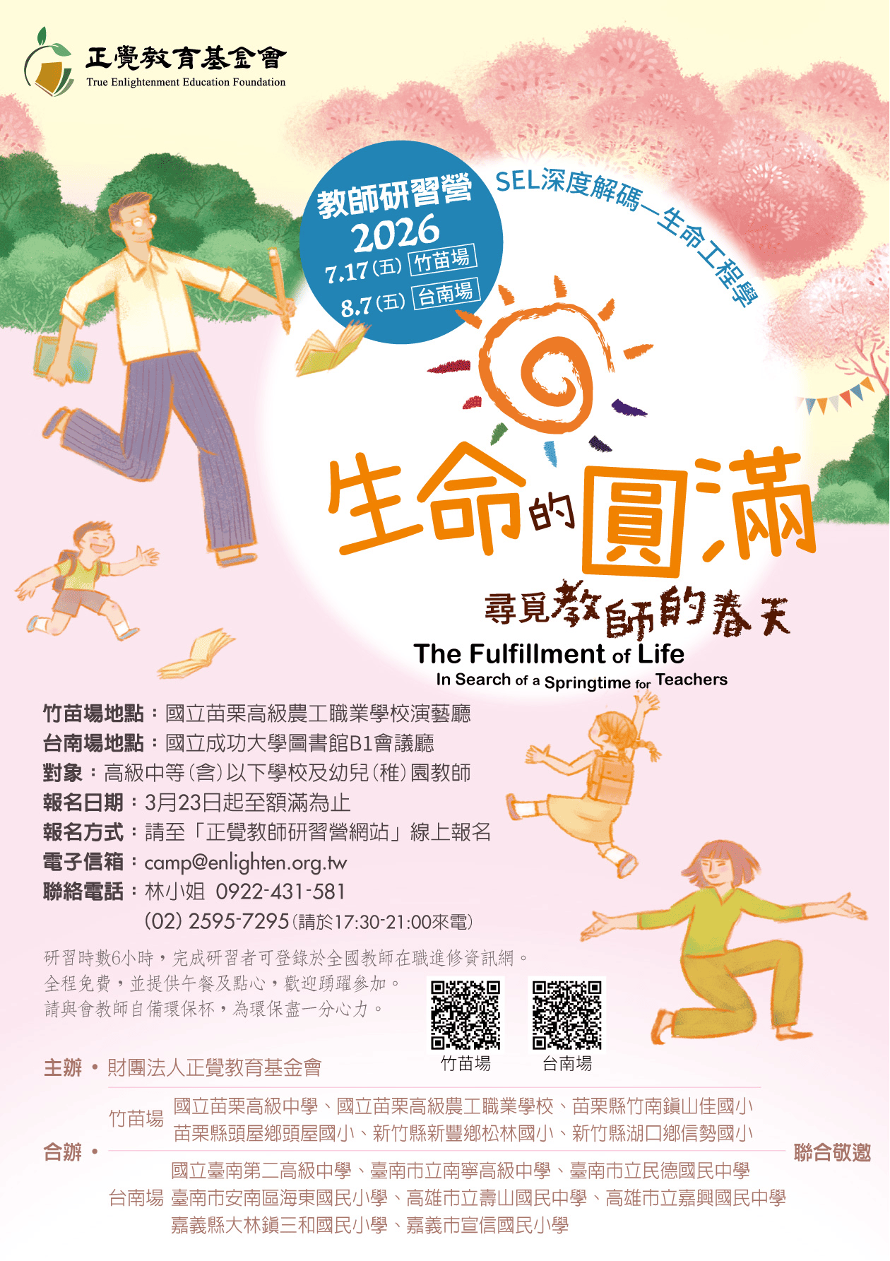 轉知財團法人正覺教育基金會辦理生命教育教師研習活動「生命的圓滿──尋覓教師的春天」