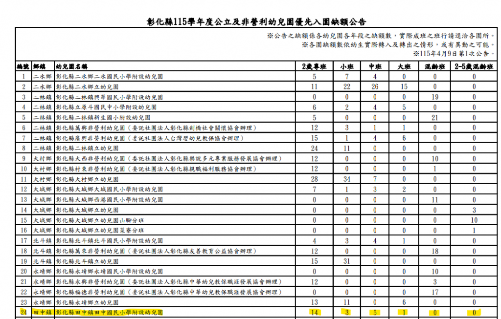 115學年度田中國民小學附設幼兒園第一階段招生人數