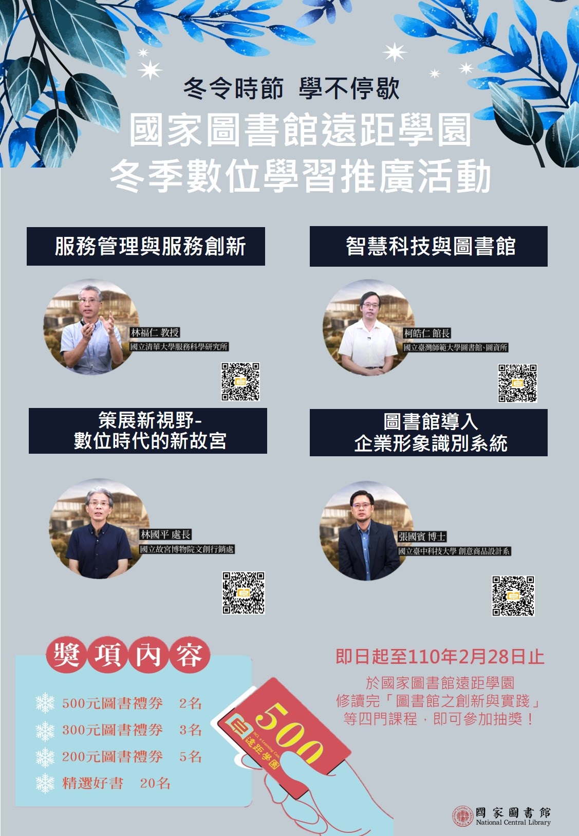 轉知國家圖書館即日起至110年2月28日(星期日)辦理「冬令時節‧學不停歇-109年度冬季數位學習推廣活動」,